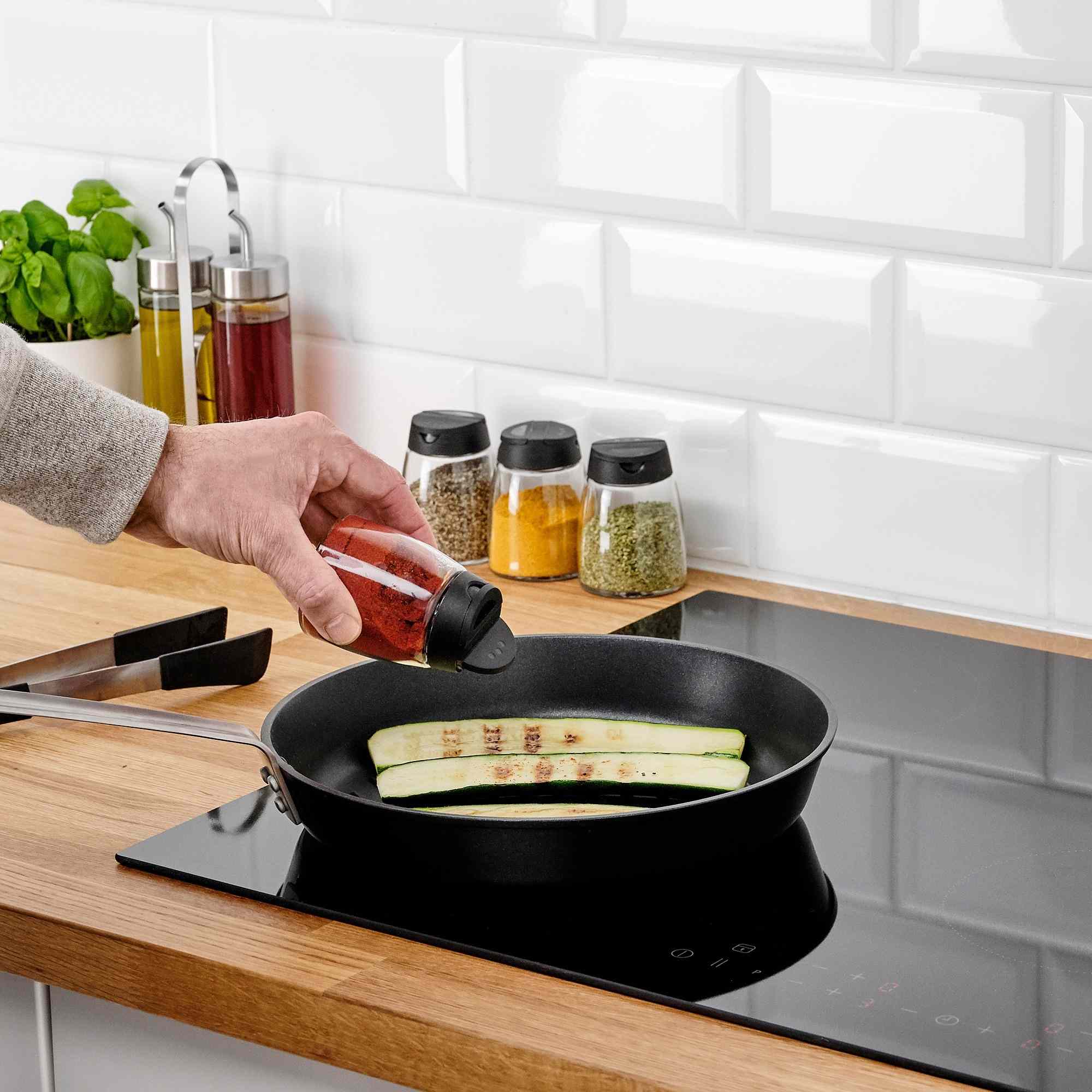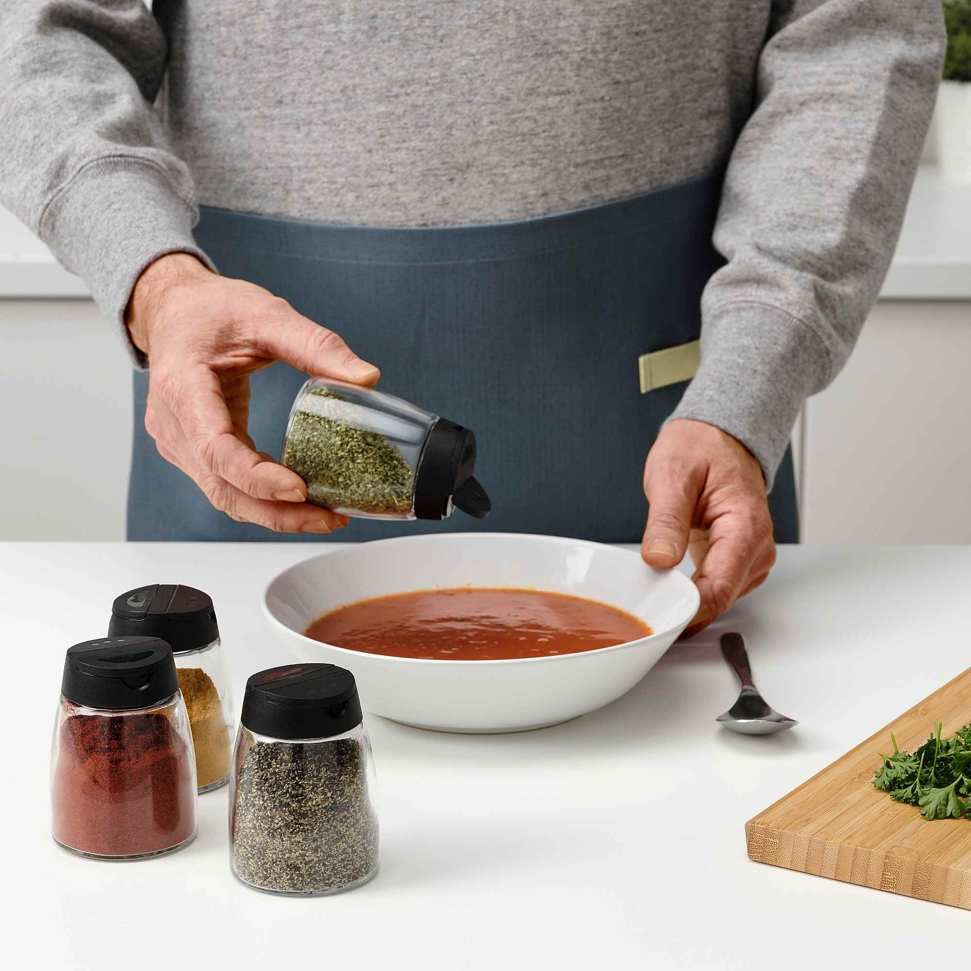 ست جای ادویه IKEA 365+ IHARDIG با دو حالت پاشش و ابعاد مناسب قابلیت جایگیری در تمامی فضاهای آشپزخانه و انواع شلف ها را دارد. درب این ظرف ها از جنس پلاستیک است. این درب به صورت پیچی روی این ظروف سوار میشود. برای استفاده از ادویه، دو نوع سوراخ ریز و درشت روی این درب ها قرار گرفته است. این سوراخ ها قابلیت جفت شدن دارند تا به صورت ناخواسته چیزی بیرون نریزد.